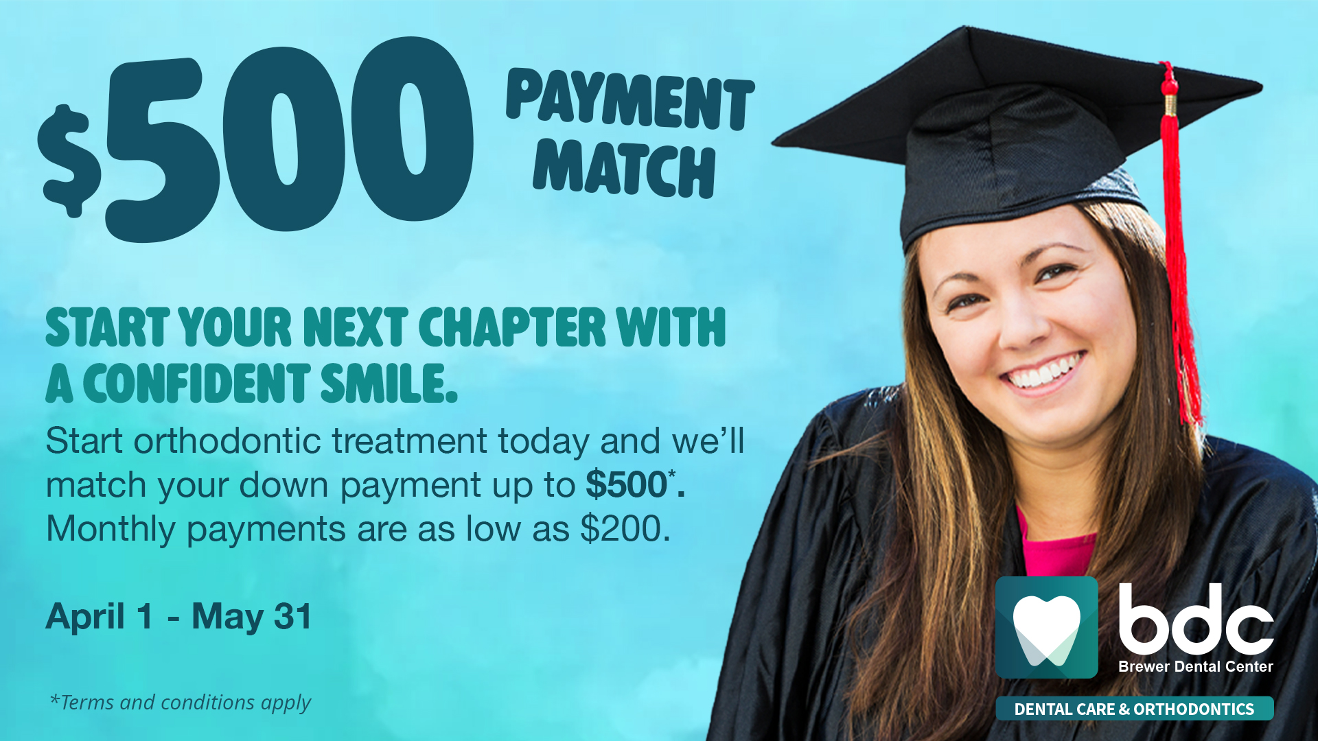 We’ll match your down payment up to $500 when you start orthodontic treatment. With monthly payments starting around $200, it’s an easy way to begin your smile journey with immediate savings.